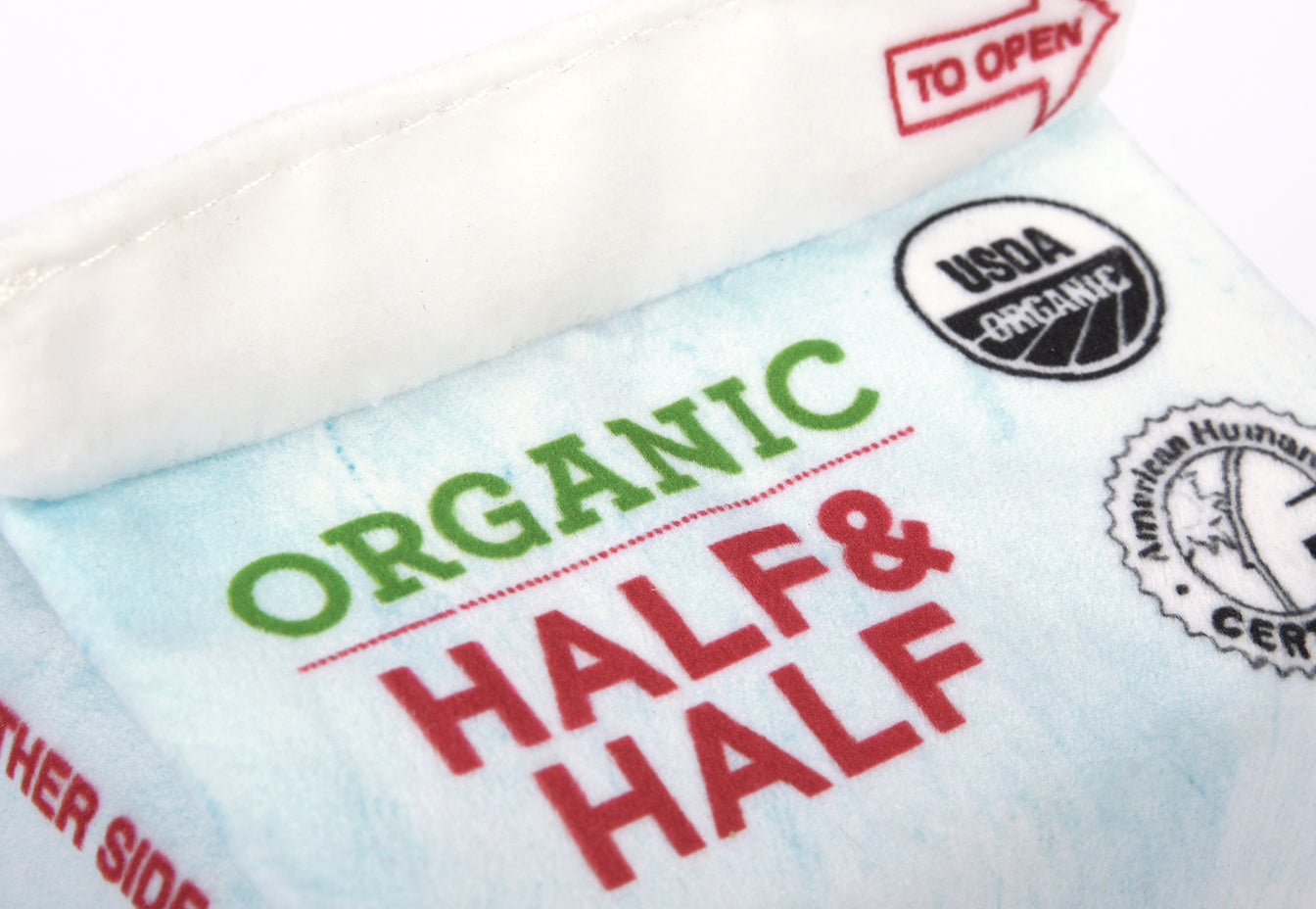 It’s time to play! But first, coffee. If coffee helps get you out of bed in the morning, then you and your furry friend are going to love waking up to this playful coffee companion we created in collaboration with fellow B Corp ! This tasty half & half carton dog toy is shockingly identical to the real thing, except that our milk box plush toy includes an enticing squeaker inside to get your furry friend’s day started off on the right paw.