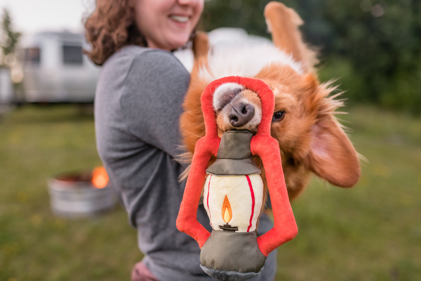 Inspired by our beloved office dog and head product tester Corbin’s love of the great outdoors, P.L.A.Y.’s Camp Corbin Dog Toy Collection was born. This collection is comprised of all of his favorite camping essentials in plush toy form including a tent with cozy sleeping bags inside and a tasty carob s’more to enjoy by the campfire.