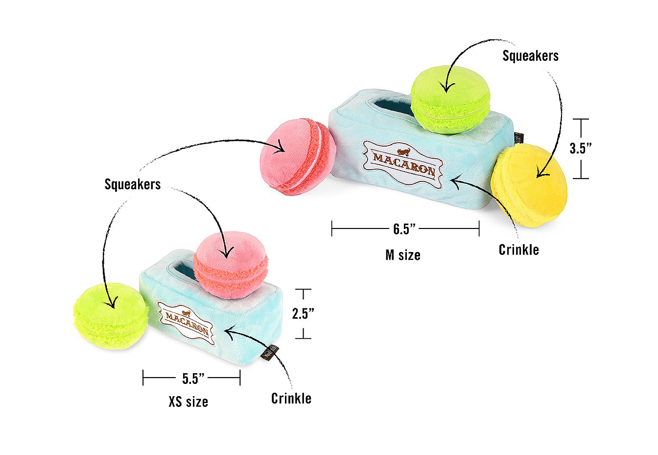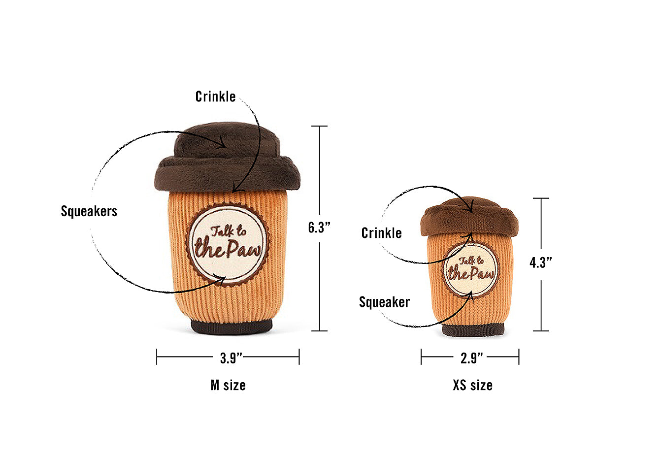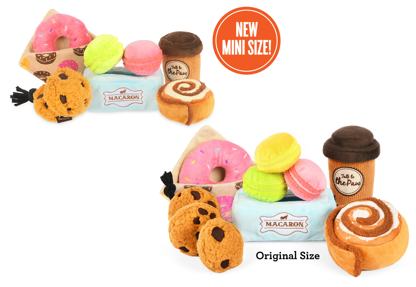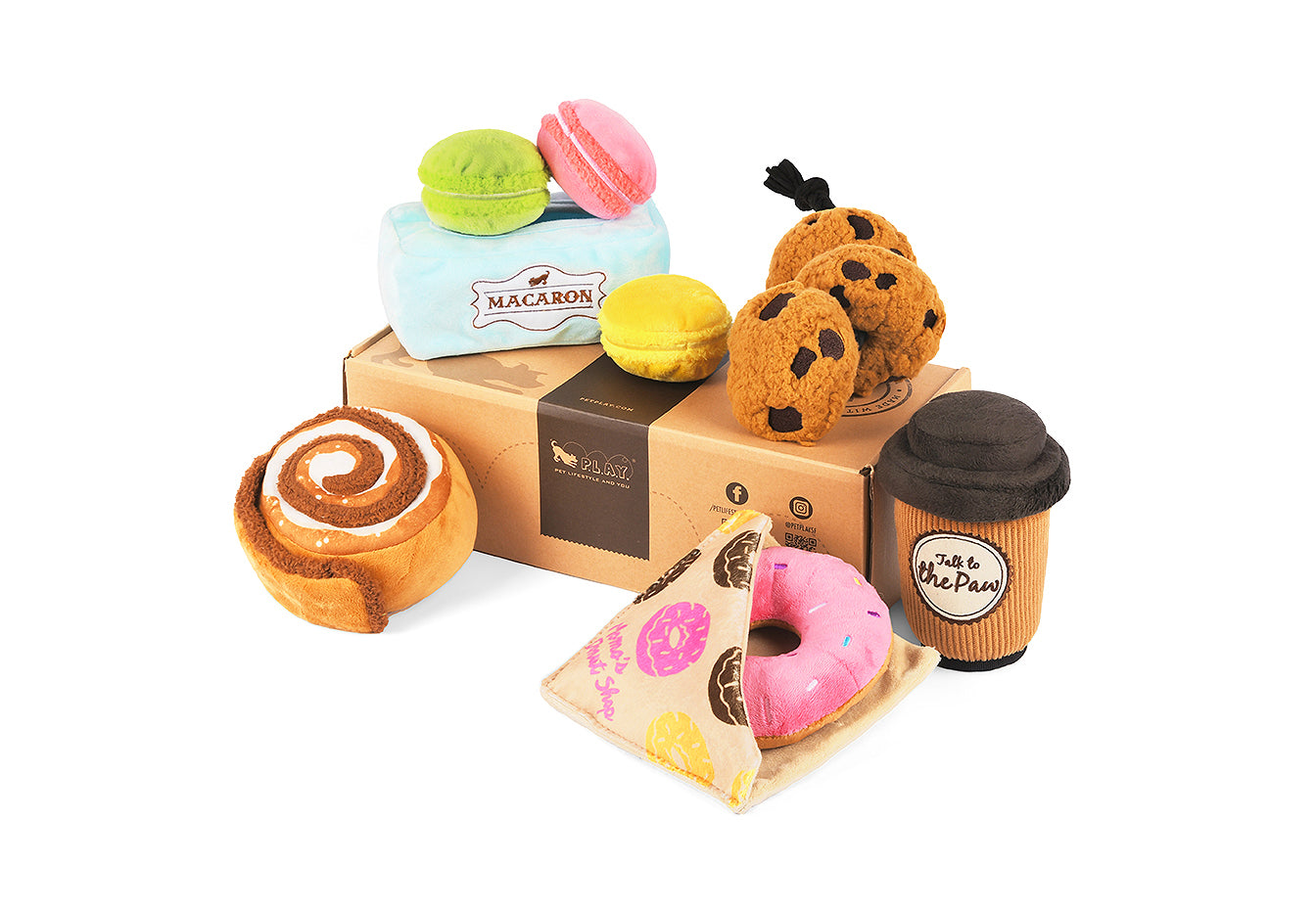Fuel up for fun with P.L.A.Y.'s Pup Cup Café Plush Toy Collection, now available in two sizes for pups of all breeds! Dive into the swirls of a warm and flakey cinnamon roll toy for hours of unraveling fun, or spice it up with a fun sprinkled donut paired with their favorite go-to coffee beverage to wash it all down! As a lil snack for later, grab some classic chocolate chip cookies, connected by a rope perfect for tug-of-war, or share some delectable macarons with furiends for a fancy game of Find-n-Seek.