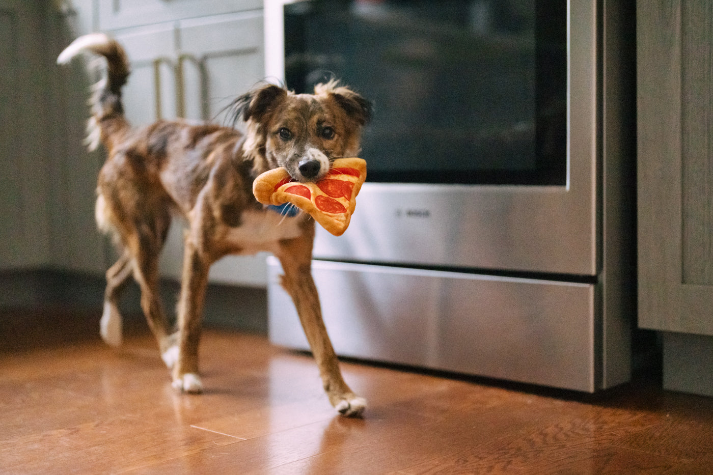 Bring the flavor of fun to playtime with P.L.A.Y.'s Snack Attack Puppy-roni Pizza toy! Available in two sizes, this slice of joy features three squeakers for maximum excitement and a t-shirt rope hidden in the crust to mimic the dough-like texture. It’s a mouthwatering toy that guarantees tail-wagging joy!